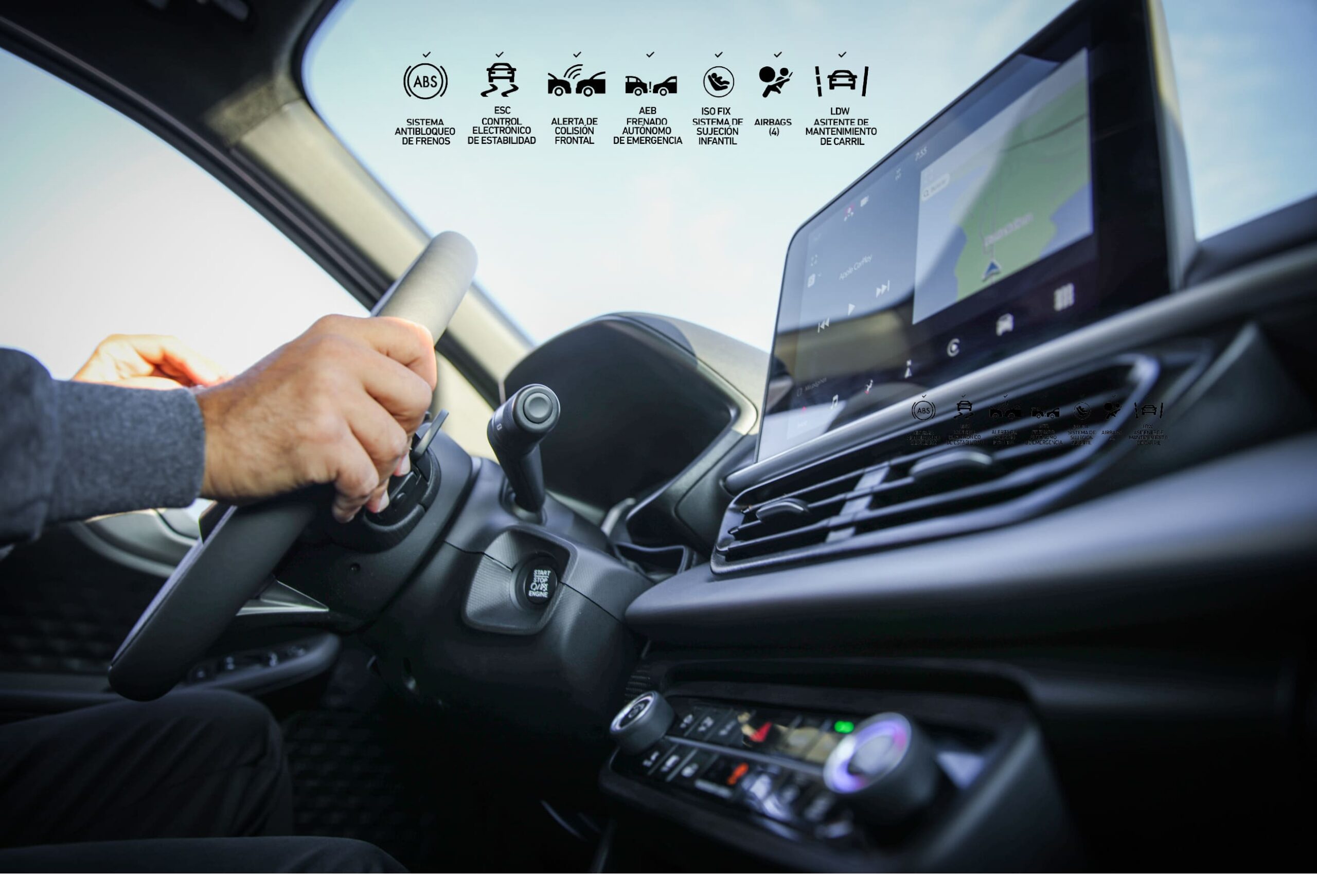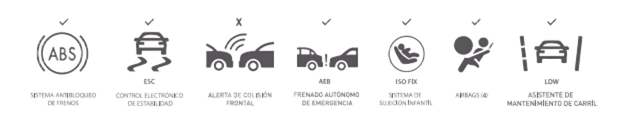 Incluye una central multimedia de 10,1 pulgadas con GPS, conectividad inalámbrica para Android Auto y Apple CarPlay, y sistemas avanzados de asistencia al conductor (ADAS) como frenado autónomo de emergencia, asistente de mantenimiento de carril y sistema automático de luces altas.
